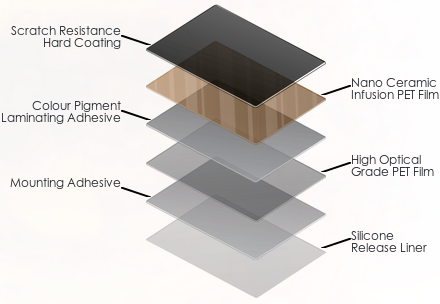 Our infusion nano ceramic plus pigment films are made by infusion nano ceramic (PET) film coated with fine nano-sized pigment particles which are blended into our adhesive by the addition of pigment binder and dispersion agents. This results in fine coated films with coherent structures of pigment and adhesive bonded together. These type of pigments films are more durable than the normal organic dye coated films. The pigments are made of inorganic compounds, hence they have the ability to reduce heat and have lower haze levels which are similar to dyed window films. The pigment films made using this method have outstanding light stability for a long period of time.